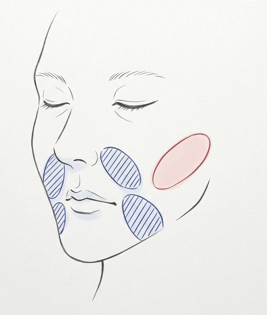 マンジャロ顔で痩せると、赤の部位が凹み、青の部位に皮膚のたるみが生じています。