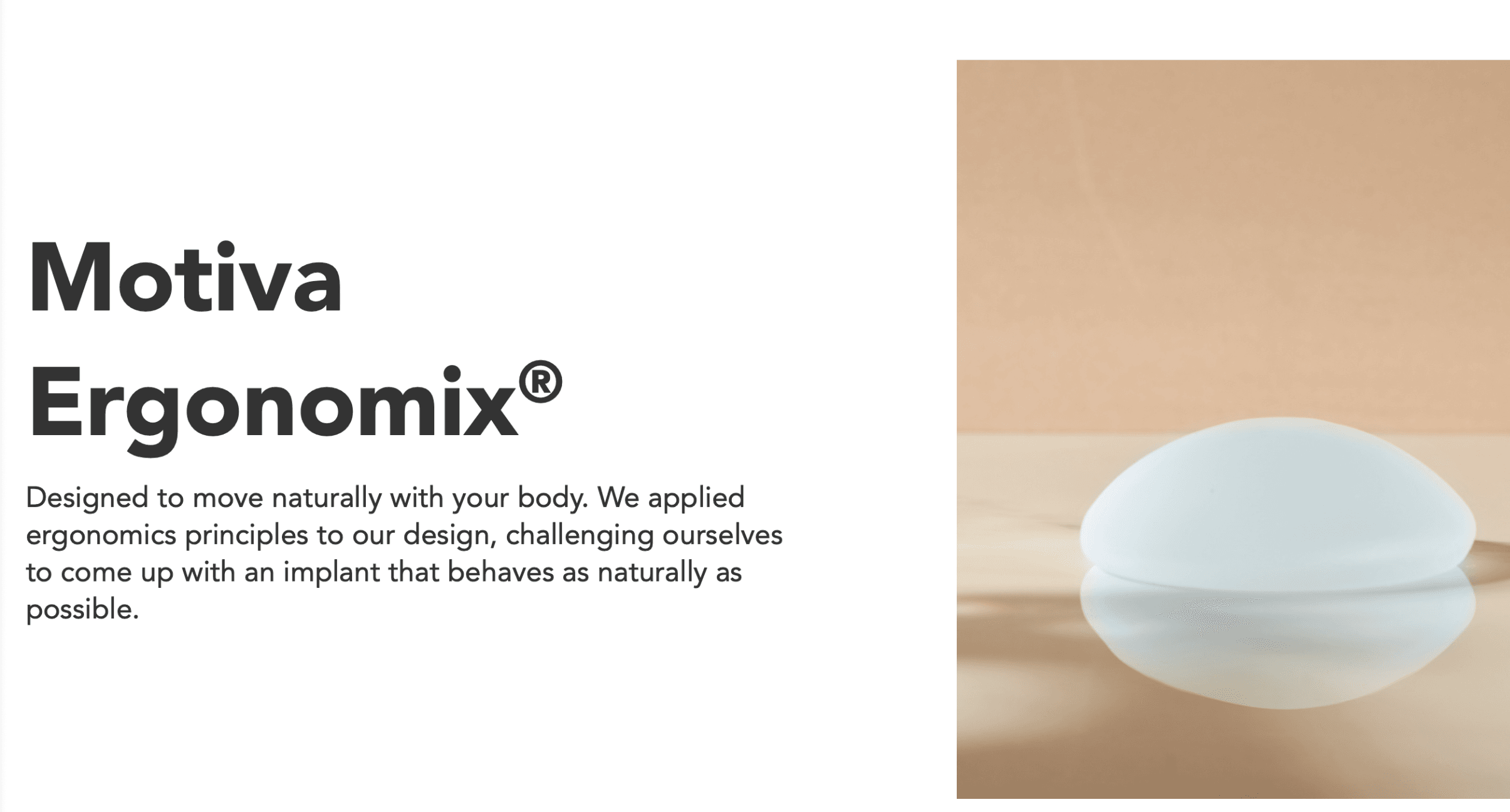 今までのインプラントは柔らかさ、拘縮など不自然さがどうしても目立っていましたが、次世代インプラント「モティバ・エルゴノミクス2」は、高度な材料工学により、これまでのバッグにはない柔らかさ・体内の動きへの追従性(ergonomic)を実現しました。